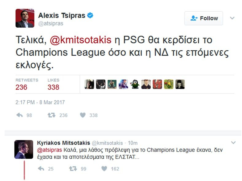 Πριν το ματς σε συνέντευξη ο Κυριάκος Μητσοτάκης είχε κάνει την πρόβλεψη ότι η Παρί όχι μόνο θα περάσει αλλά θα πάρει και το Τσάμπιονς Λιγκ. Ο Αλέξης Τσίπρας ή ο χειριστής του λογαριασμού του το θυμόταν και στο twitter ανέβηκε το μήνυμα...